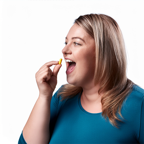 Obese woman taking pain pill to eliminate joint pain