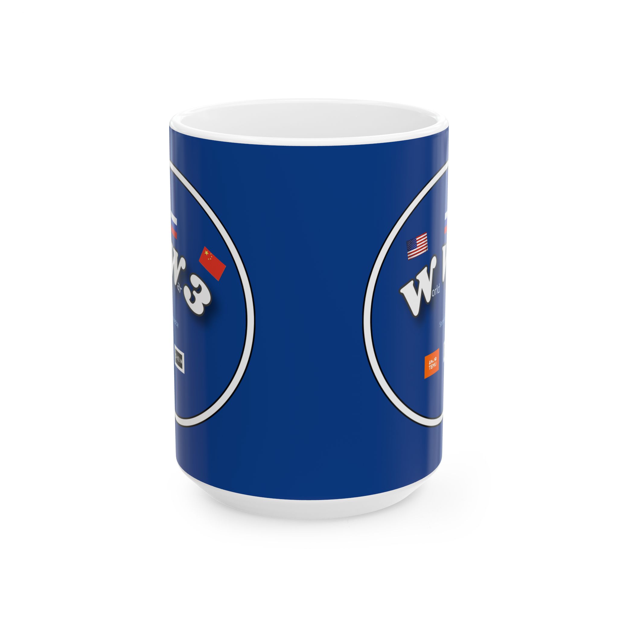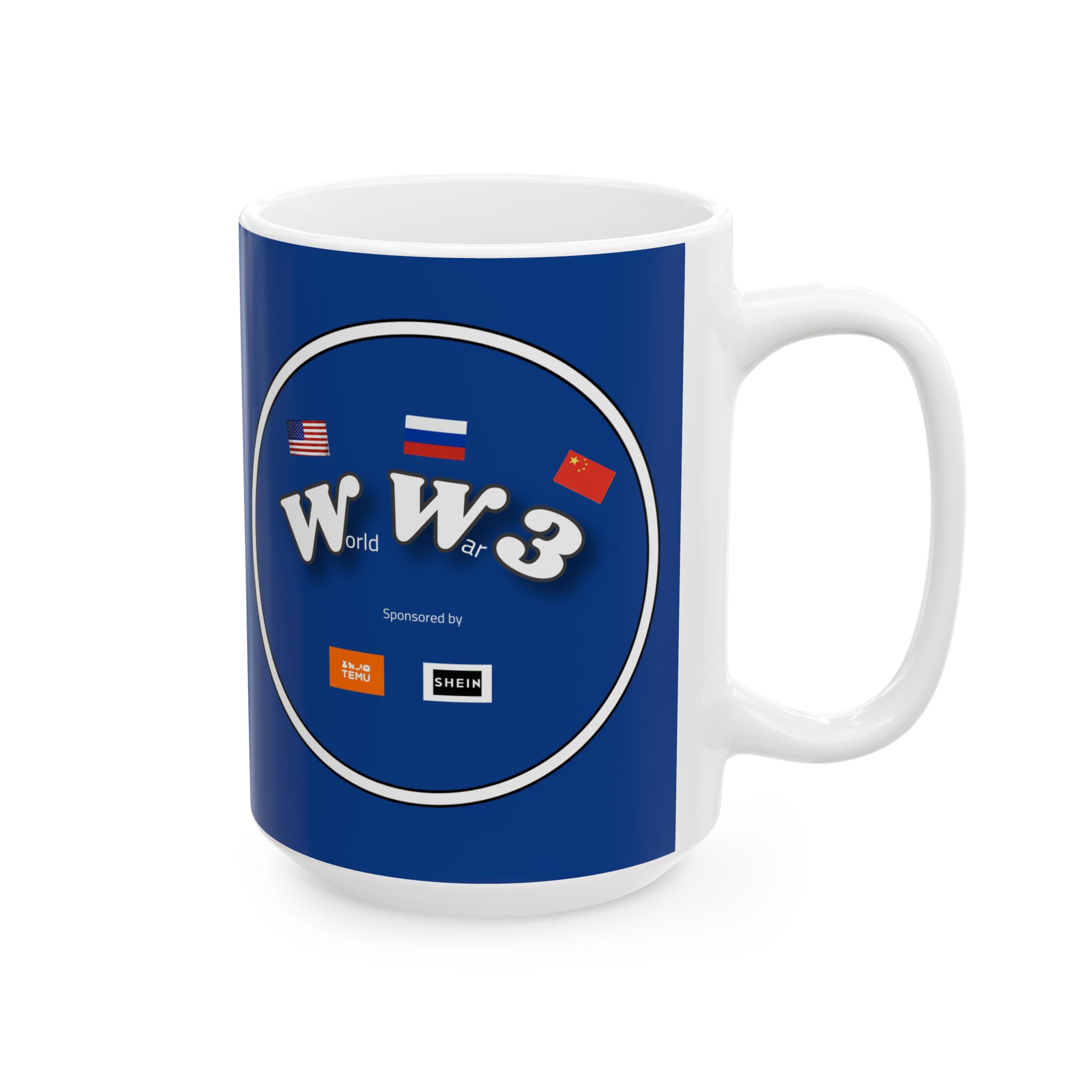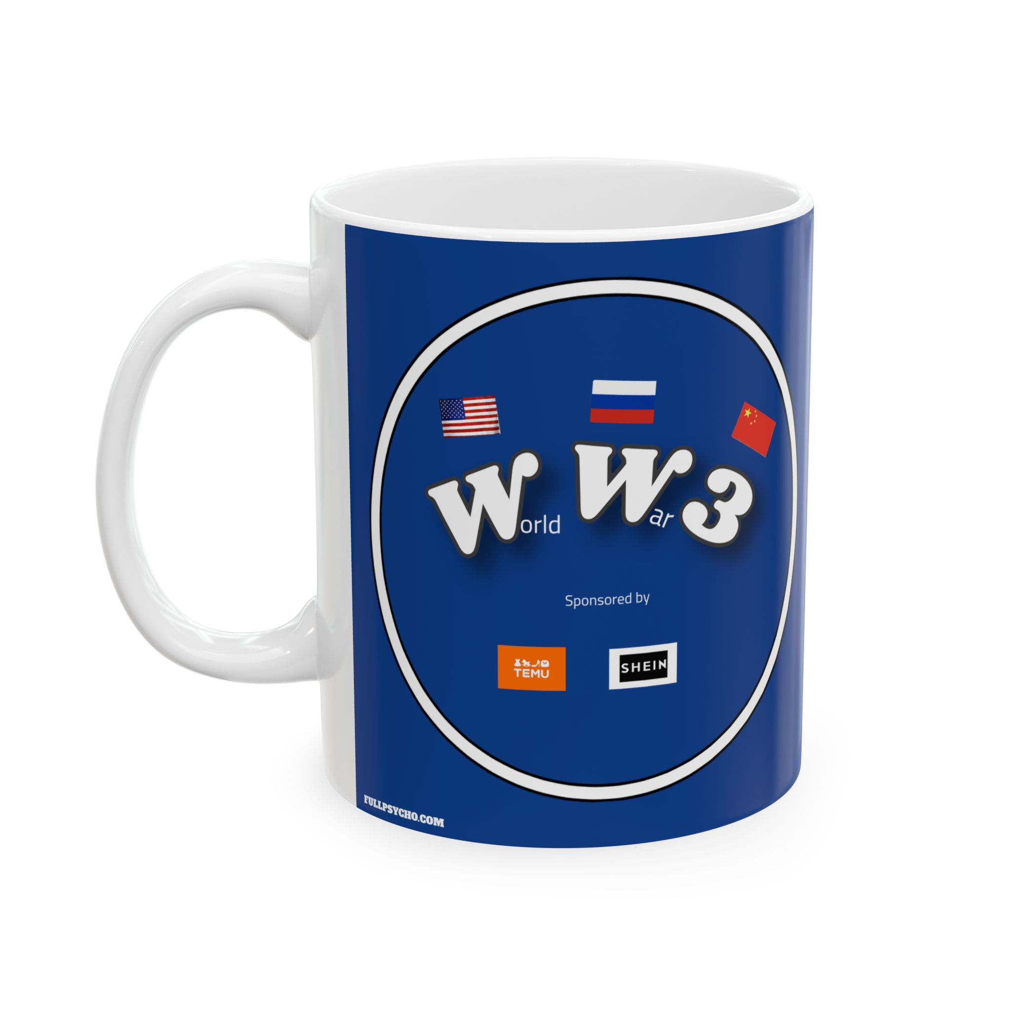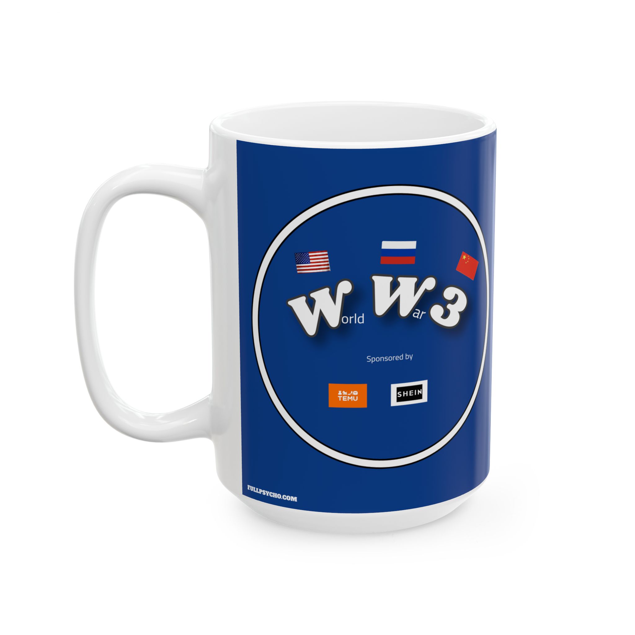 The Full Psycho World War 3 sponsored by Temu and Shein is BPA and Lead-free, microwave & dishwasher-safe, and made of white, durable ceramic in 11-ounce and 15-ounce sizes.