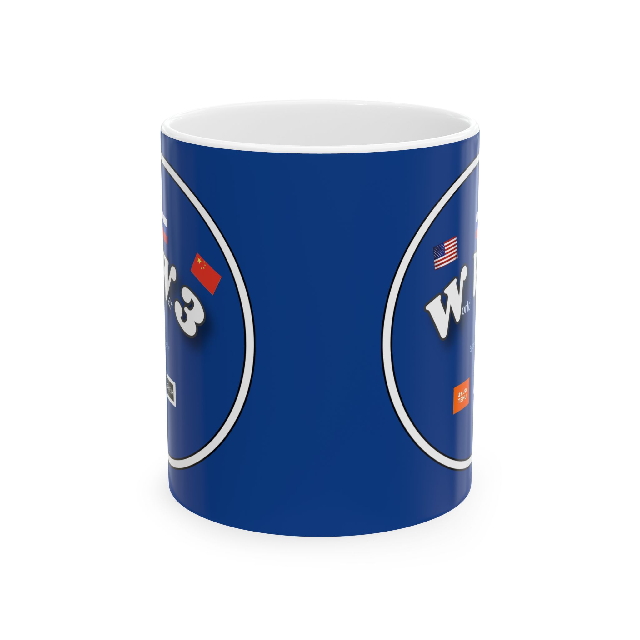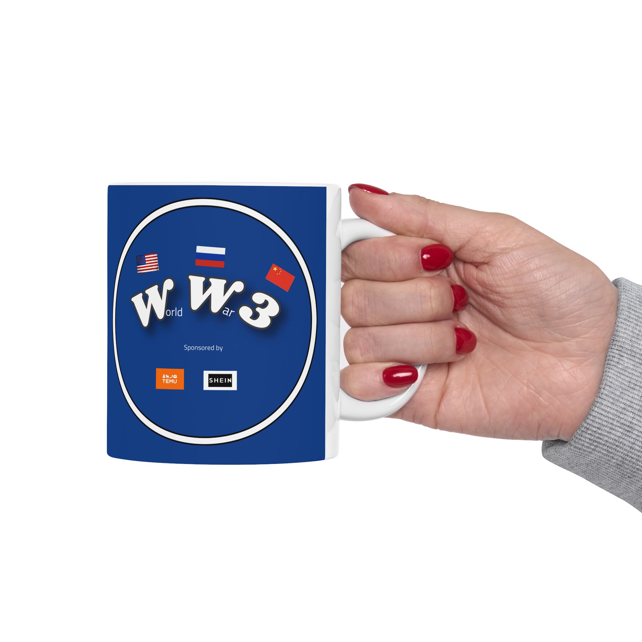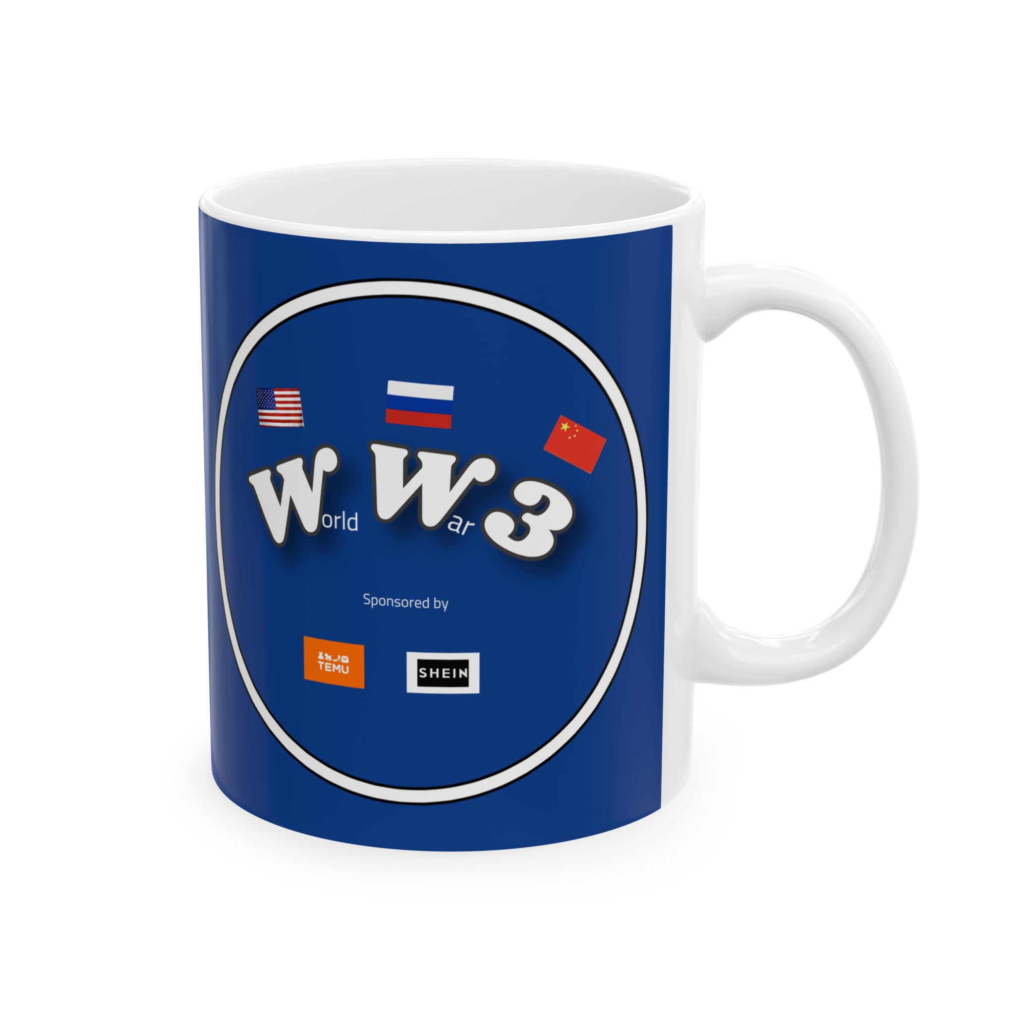 The Full Psycho World War 3 sponsored by Temu and Shein is BPA and Lead-free, microwave & dishwasher-safe, and made of white, durable ceramic in 11-ounce and 15-ounce sizes.