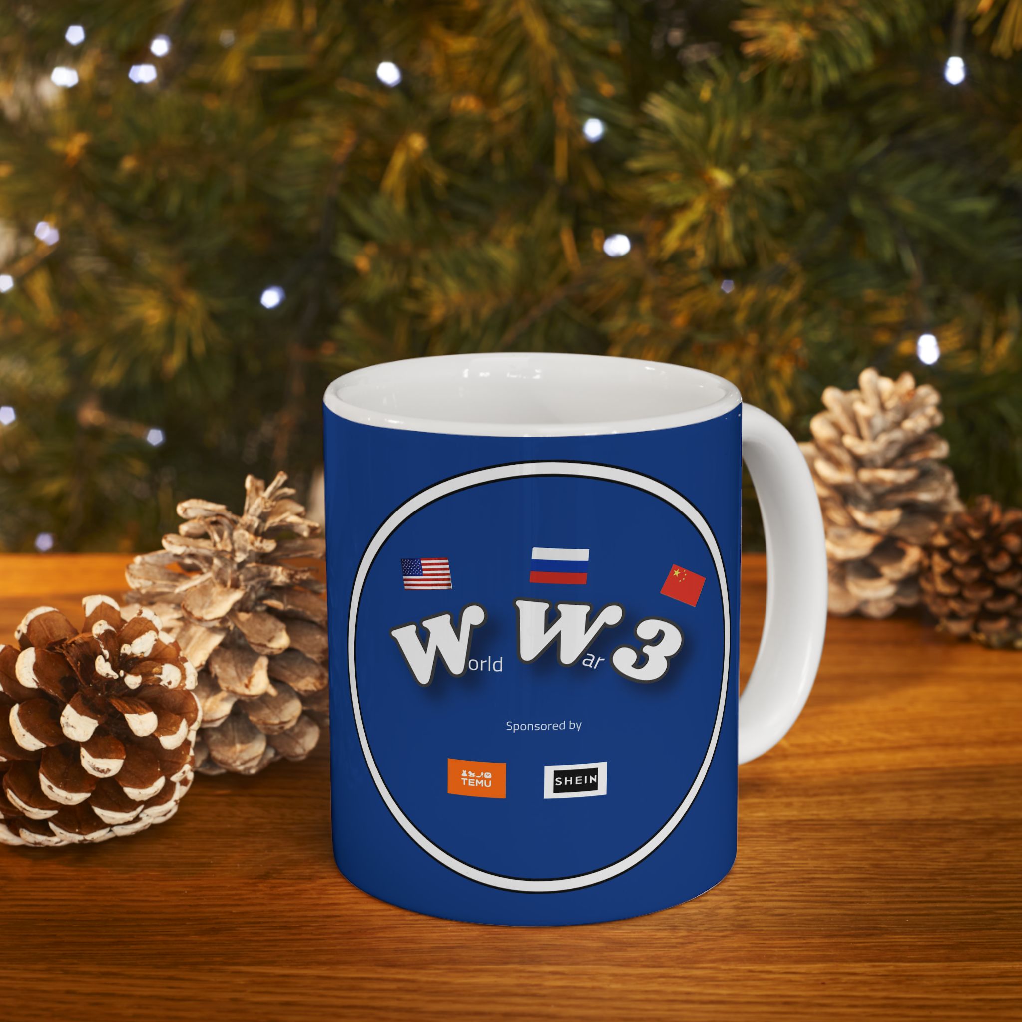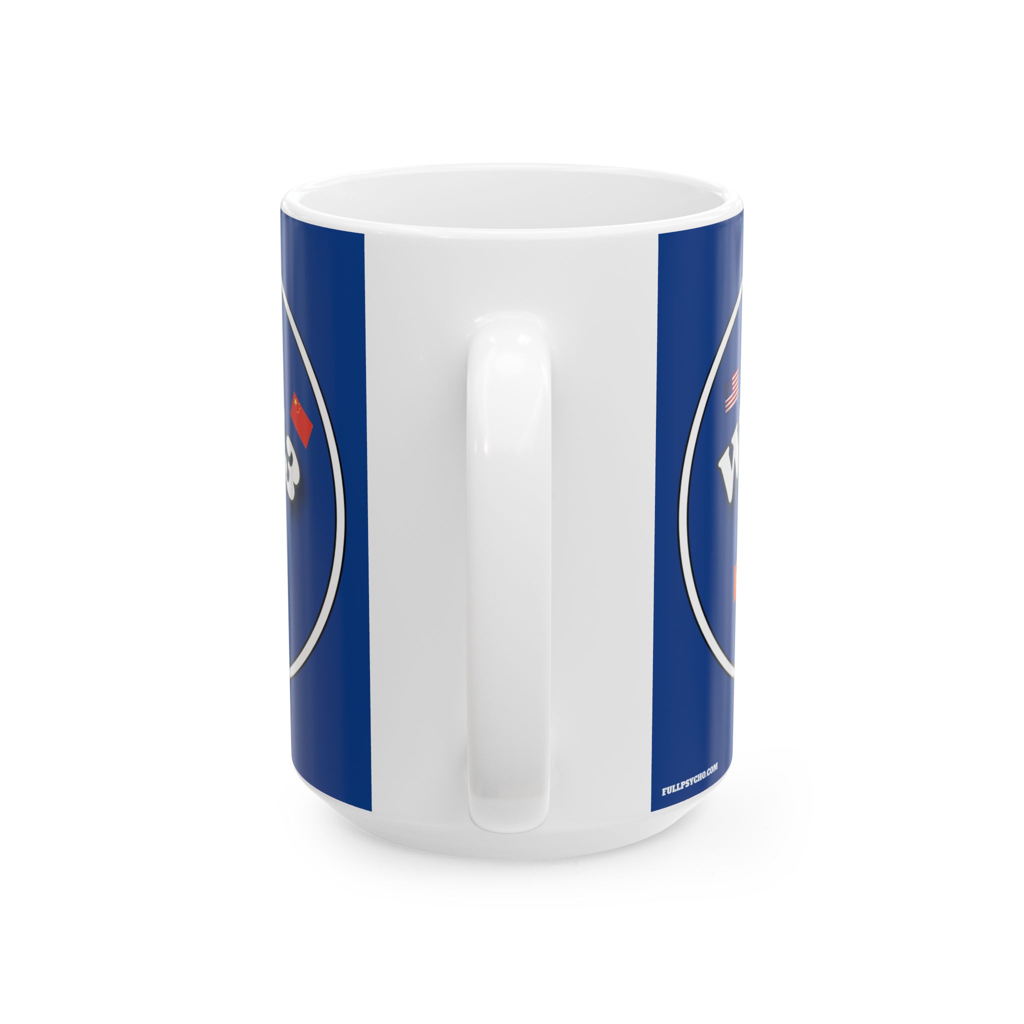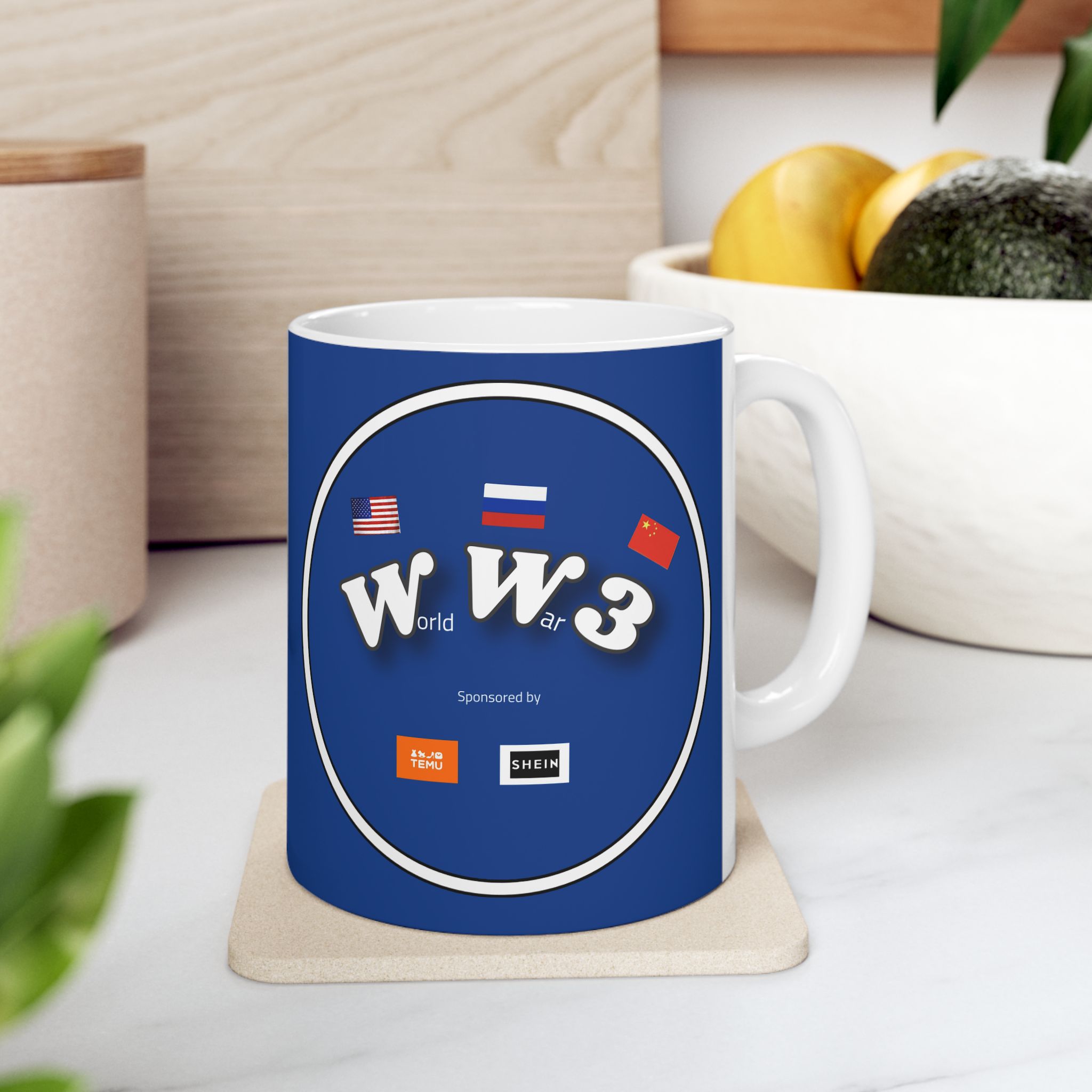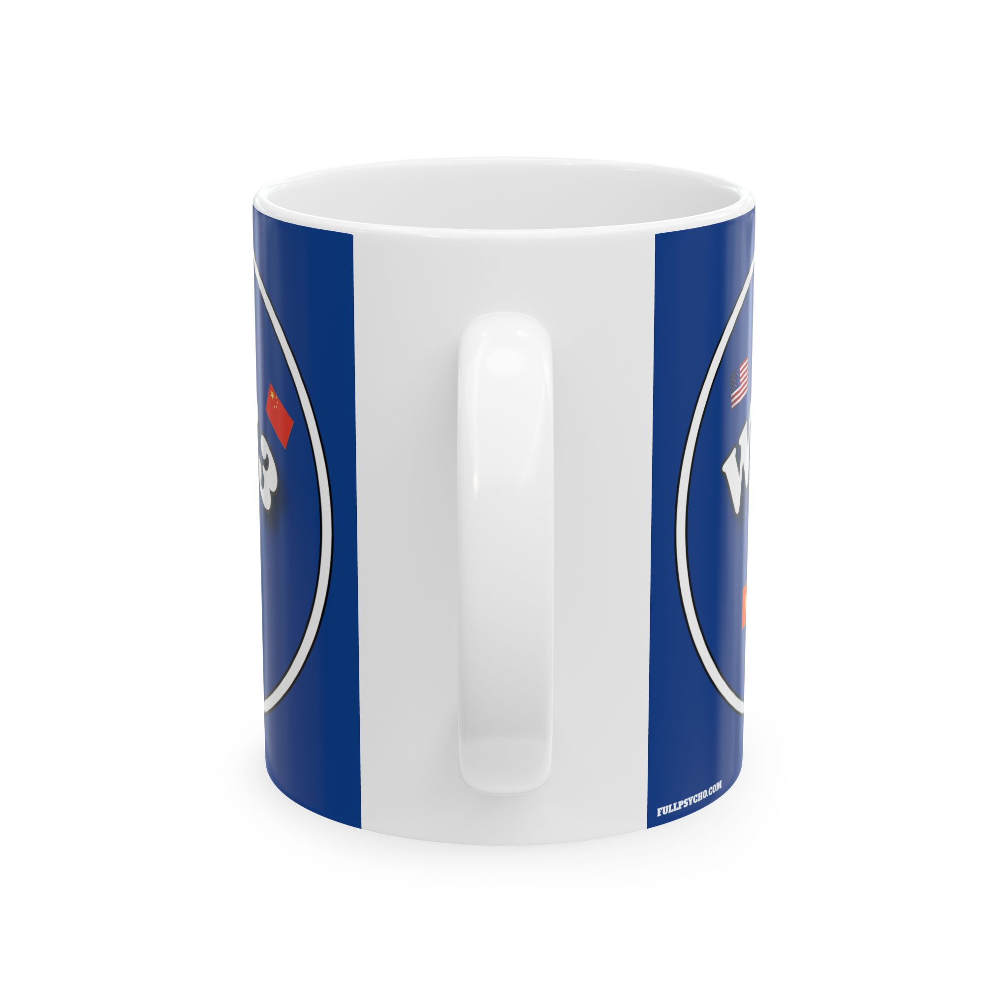 The Full Psycho World War 3 sponsored by Temu and Shein is BPA and Lead-free, microwave & dishwasher-safe, and made of white, durable ceramic in 11-ounce and 15-ounce sizes.